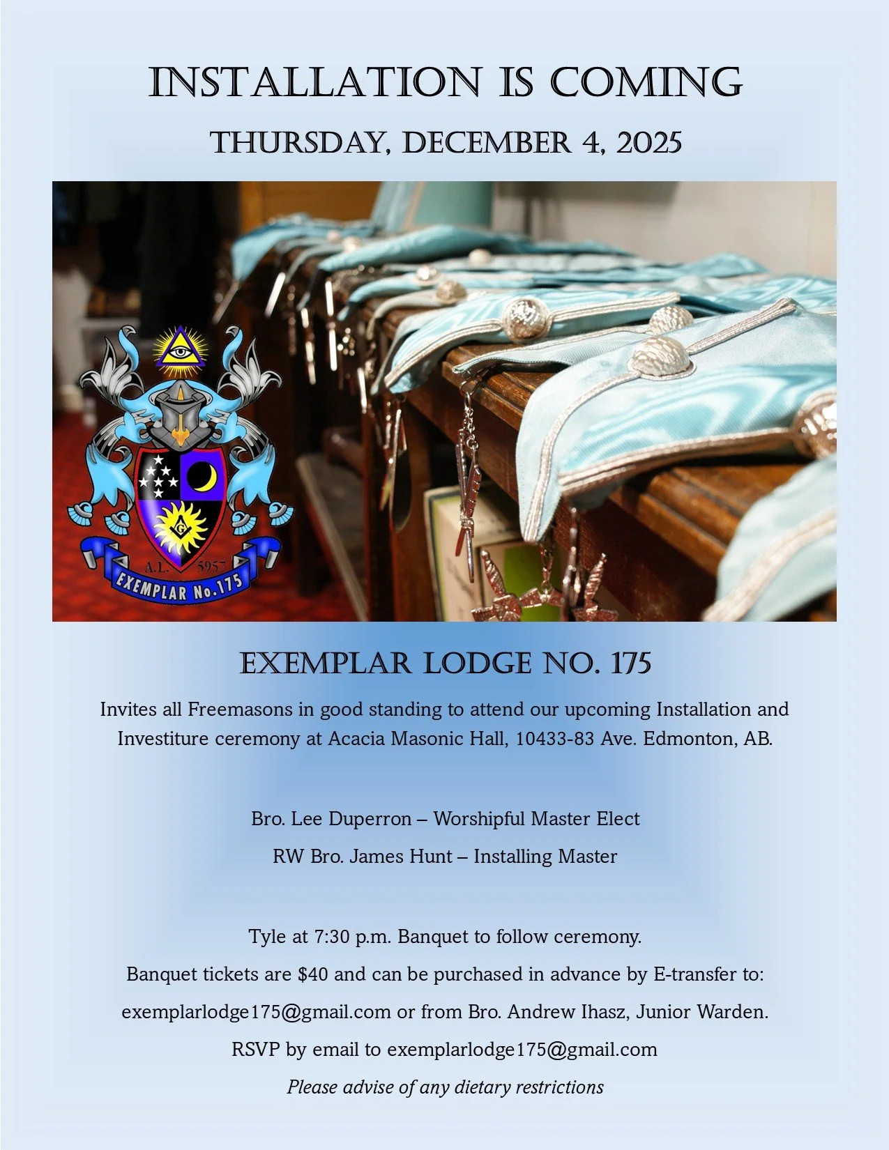 Exemplar Lodge, like all lodges, hold several special events each year. Fellowship, family and fun are intrinsic to Freemasonry, and considerable effort goes into planning and organizing events that will provide opportunities outside the formal environment of the lodge room to spend time with brethren, family and friends.